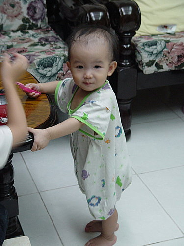 當天他以迅雷不及掩耳的速度進化到人類階段,並且努力的往前邁進。從那天起,除了跟哥哥玩「追追追」的時候會以較快的速度爬行之外,其餘時間都間覺得用站的來從事所有活動;不論吃飯、看電視、玩玩具...真懷疑他怎麼腳不會酸呢?!